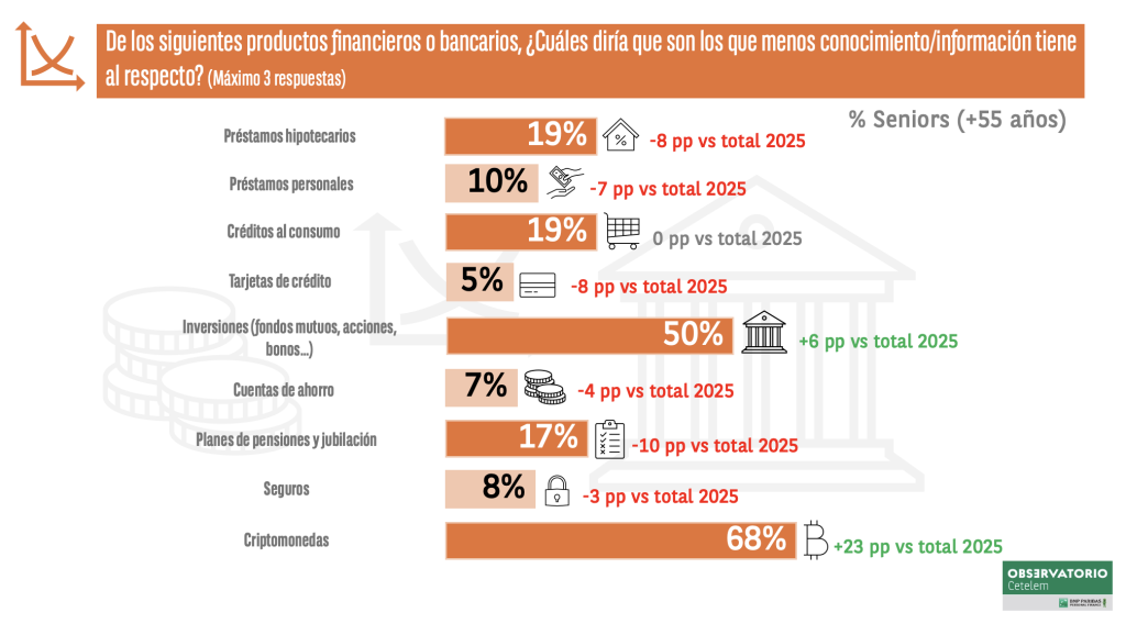 El 68,4% de los sénior no tiene conocimientos sobre criptomonedas y el 50,3% desconoce conceptos básicos de inversión. Les siguen los créditos al consumo, préstamos hipotecarios y planes de pensiones, con un 19,2%, 18,6% y 16,6%, respectivamente. En cuanto a los productos sobre los que los sénior desean recibir más información, destacan planes de pensiones, criptomonedas, préstamos personales y seguros, aunque en algunos casos por debajo de la media nacional.