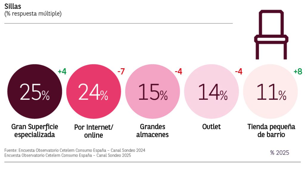 Para la compra de productos del sector muebles de cocina, observamos cómo el 28% de los consumidores declaran no haber realizado consultas previas, mostrando un descenso de 2 puntos respecto a 2024. La importancia de la consulta con el personal de la tienda continúa en aumento y vuelve a estar en segundo lugar con un 27% de menciones y un crecimiento de 3 puntos respecto a 2024. El top 3 lo cierran aquellos que consultan el catálogo (on/off) de la tienda con un 22% de respuestas.