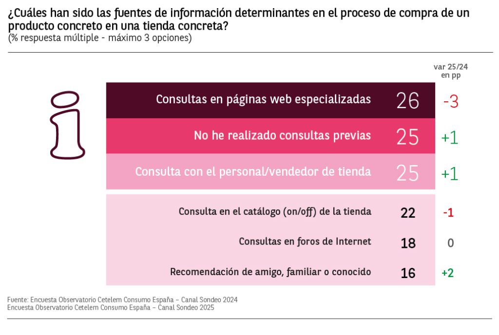 Para la compra de productos de este sector, observamos cómo el 26% de los españoles encuestados asegura consultar antes en páginas web especializadas (29% en 2024). Los que consultan con el personal de la tienda son el 25% y los que consultan en catálogo de la tienda tanto online como offline cierran el top 3 con un 22% de menciones.