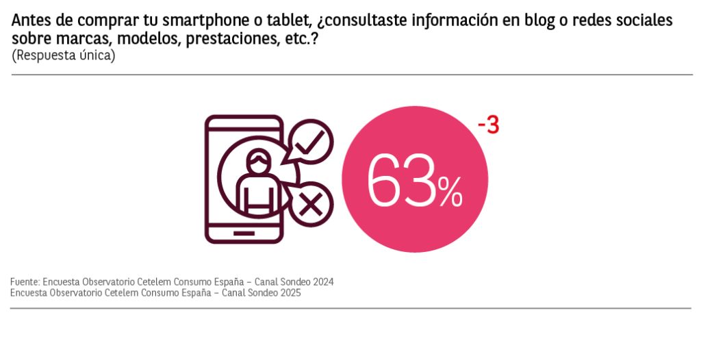 El 63% de los españoles encuestados dice que se informa en blogs y redes sociales antes de comprar su smartphone o Tablet, disminuyendo este porcentaje en 3 puntos respecto al año anterior.