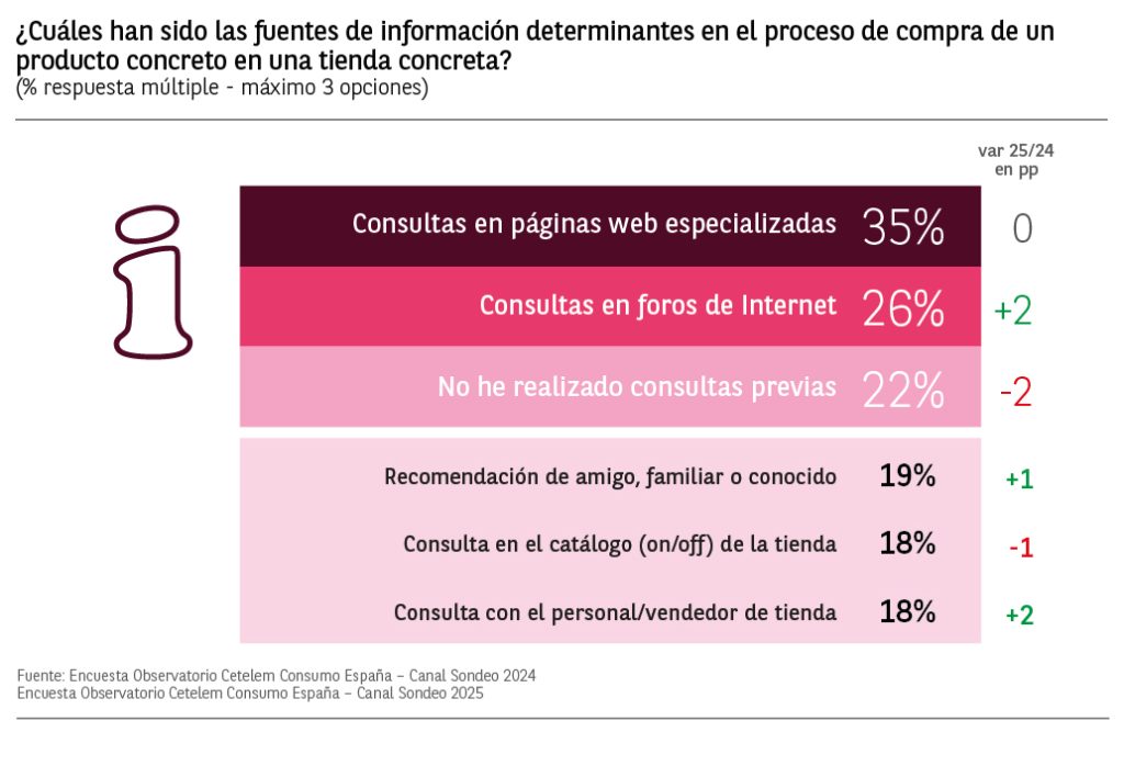 Para la compra de productos del sector dispositivos móviles, observamos cómo el 35% de los españoles encuestados asegura consultar antes en páginas web especializadas. Los que consultan en foros de internet son el 26%, y con un 22% encontramos a los que dicen no realizar consultas previas a la compra. Vuelve a crecer el porcentaje de los que optan por consultar con el personal de la tienda.