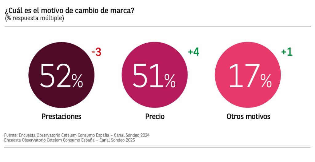 Entre los consumidores que han decidido cambiar de marca, en primer lugar, encontramos este año a los que lo han hecho por las prestaciones con un 52% de menciones, seguidos de cerca por un 51% que se ha guiado por el precio.