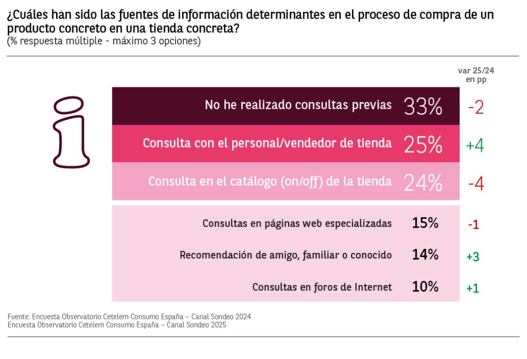 La mayor parte de los consumidores (33%) se deciden a comprar el producto del sector muebles sin realizar consultas previas, aunque mostrando un descenso de 2 puntos respecto a 2024.