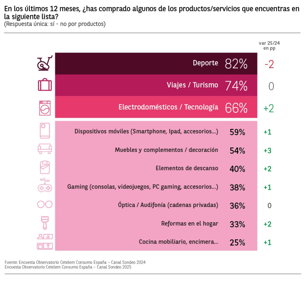 Los productos más adquiridos por los consumidores españoles en los últimos 12 meses han sido los relacionados con el deporte, los viajes, los electrodomésticos/tecnología.