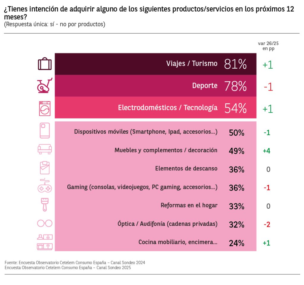 Le siguen las intenciones de compra manifestadas para electrodomésticos y tecnología y dispositivos móviles, con un 54% y un 50% de menciones respectivamente. El resto de los sectores muestran intenciones de compra por debajo del 50%.