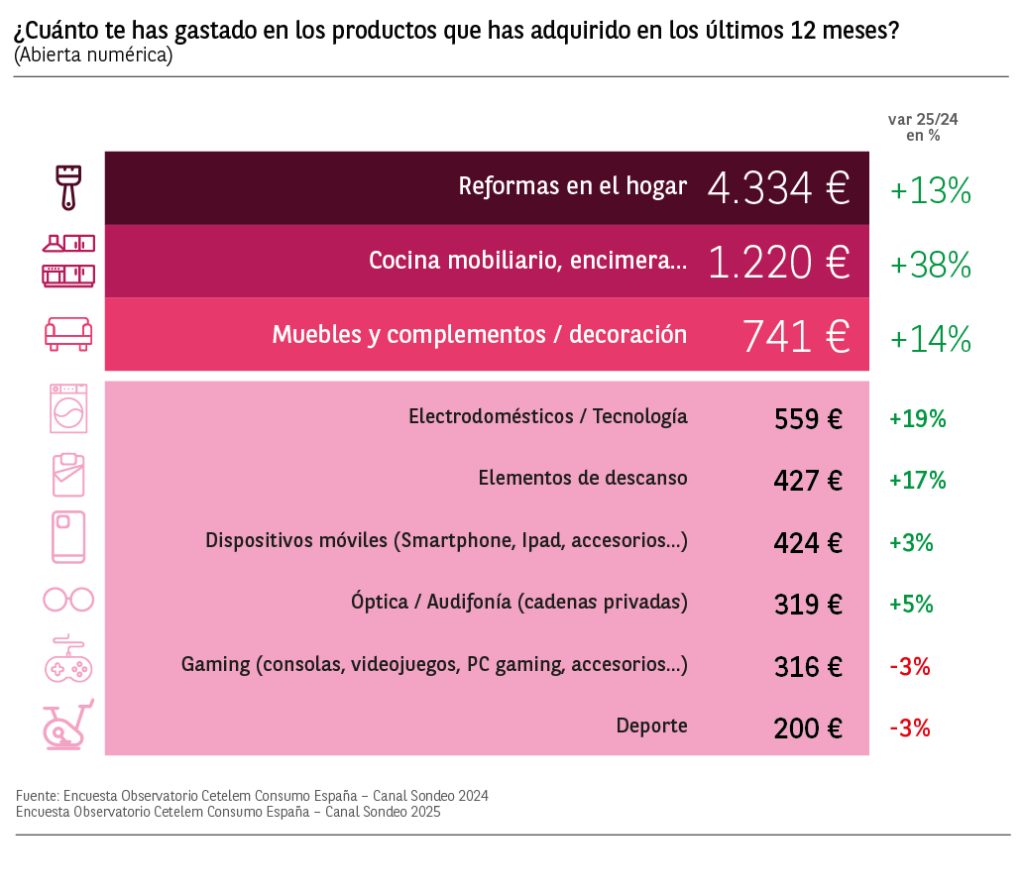 El gasto más elevado es el realizado en el sector reformas con un gasto medio de 4.334€ y un crecimiento del 13% respecto al año anterior. Le sigue el de muebles de cocina que con un importe medio de 1.220€, crece un 38%. En tercer lugar, encontramos el gasto realizado en muebles y complementos con un gasto medio de 741€ y un crecimiento del 14% respecto a 2024.