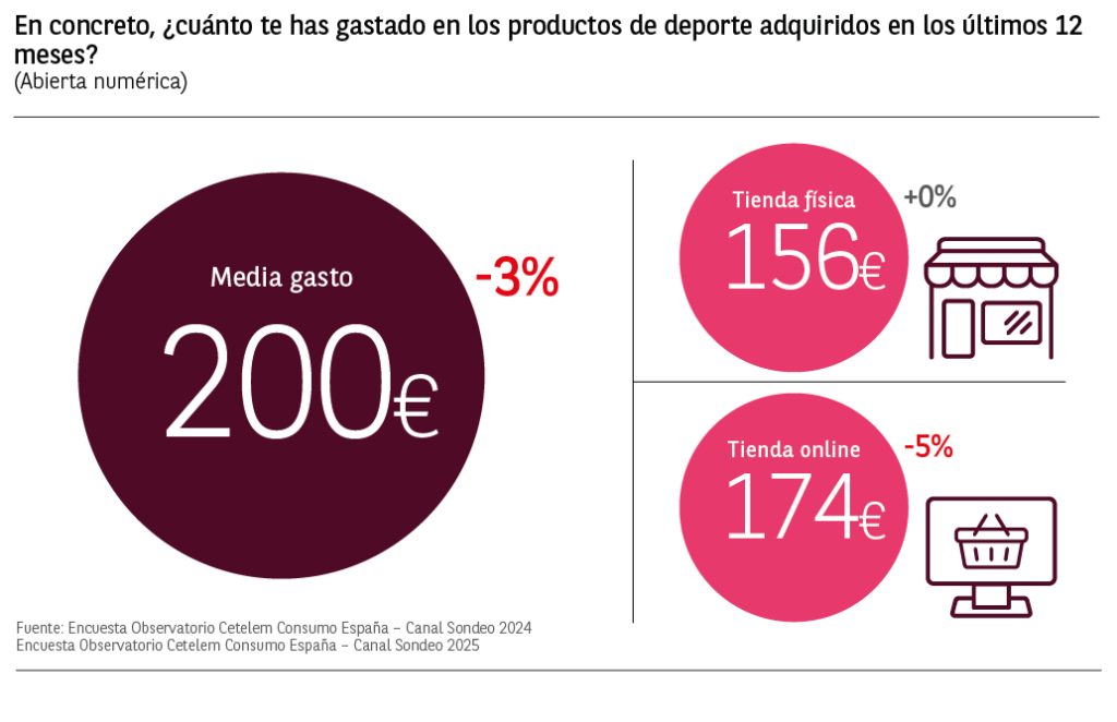El gasto medio declarado por los consumidores que ha comprado algún tipo de producto deportivo en los últimos 12 meses es de 200€, un 3% menos respecto al gasto medio de 2024, en el que se gastaron 206€ de media.