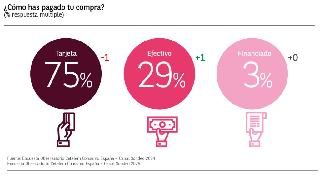 De los que han respondido que pagaron con tarjeta, un 68% declara haberlo hecho mediante tarjeta de débito, 2 puntos porcentuales más que en 2024. Por detrás encontramos a los consumidores que utilizaron su tarjeta de crédito fin de mes con un 32% (33% en 2024).