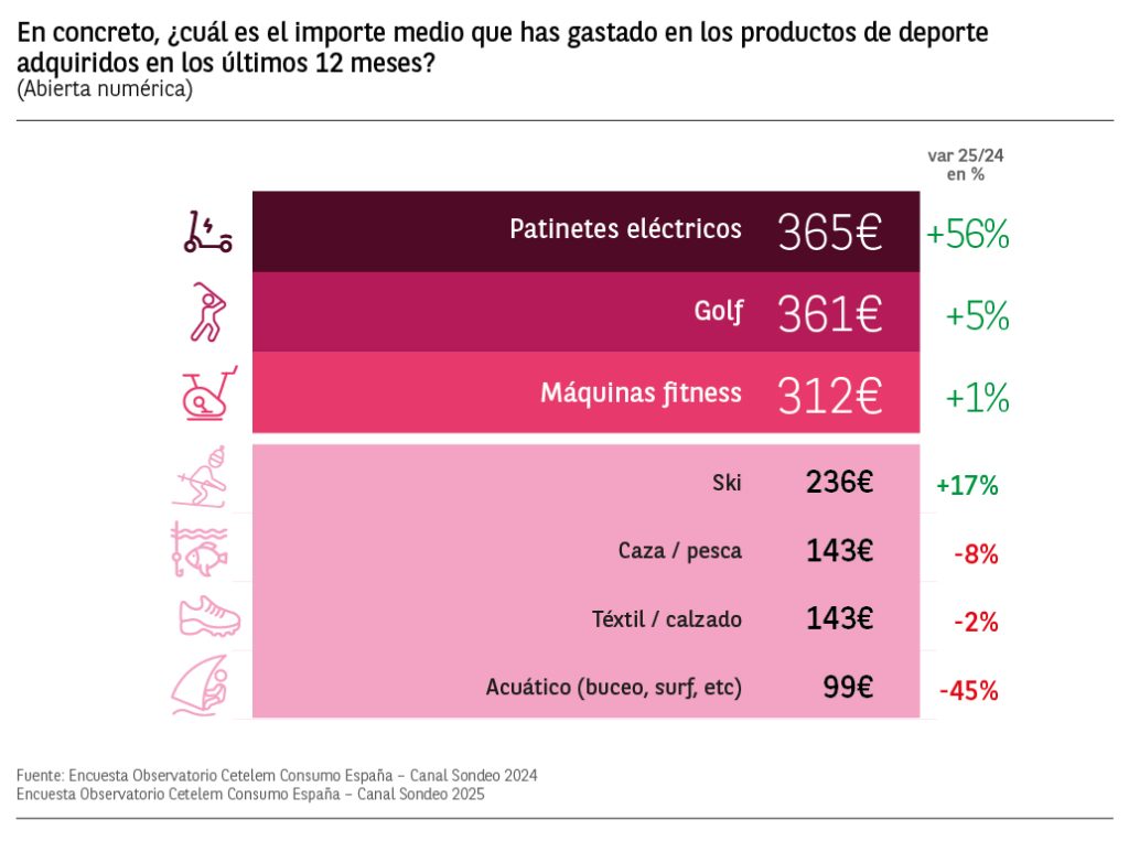 Las 2 categorías donde más han gastado los consumidores españoles este año han sido en patinetes eléctricos con un gasto medio de 365€ (+56% vs 2024) y en productos de golf con un gasto medio de 361€.