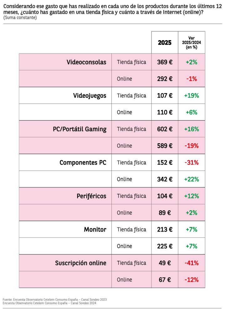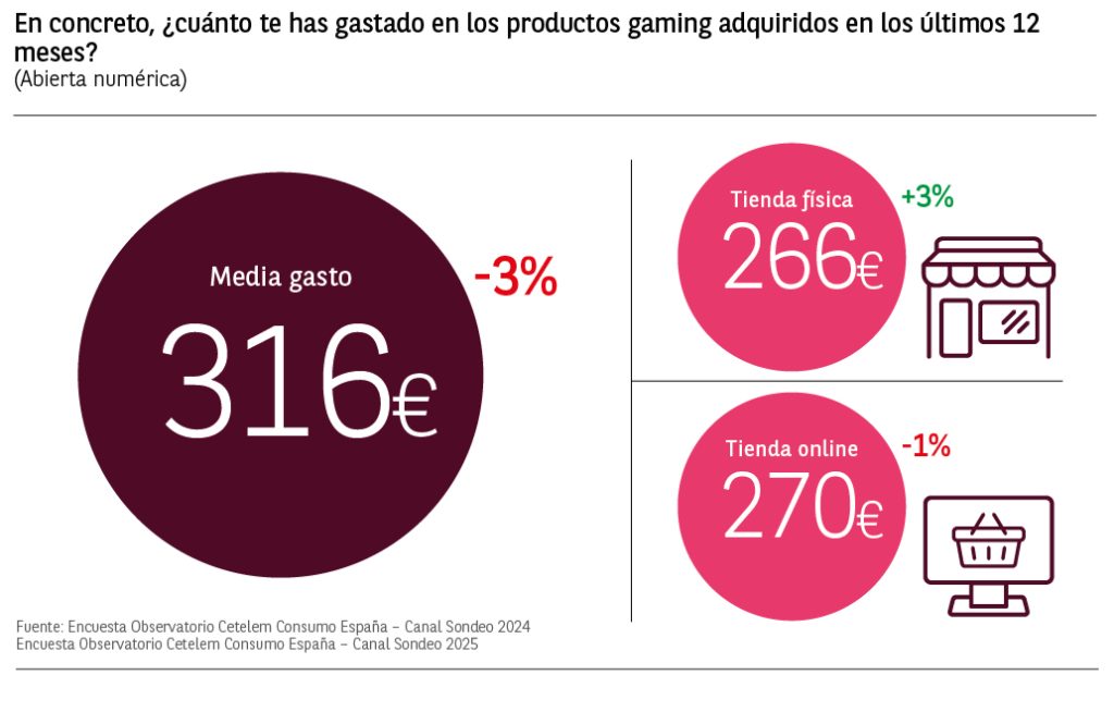 El gasto medio declarado por los consumidores que ha comprado algún tipo de producto del sector gaming en los últimos 12 meses es de 316€, un 3% menos que el declarado en 2024. El gasto medio general en tienda física es un 3% superior al de 2024 y el gasto en tienda online desciende ligeramente en un 1%.