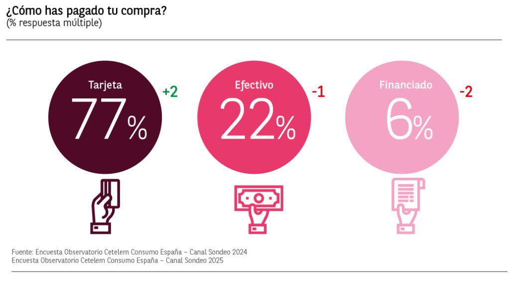 De los que han respondido que pagaron con tarjeta, un 75% declara haberlo hecho mediante tarjeta de débito. Por detrás encontramos a los consumidores que utilizaron su tarjeta de crédito con un 24% (-5pp vs 2024).