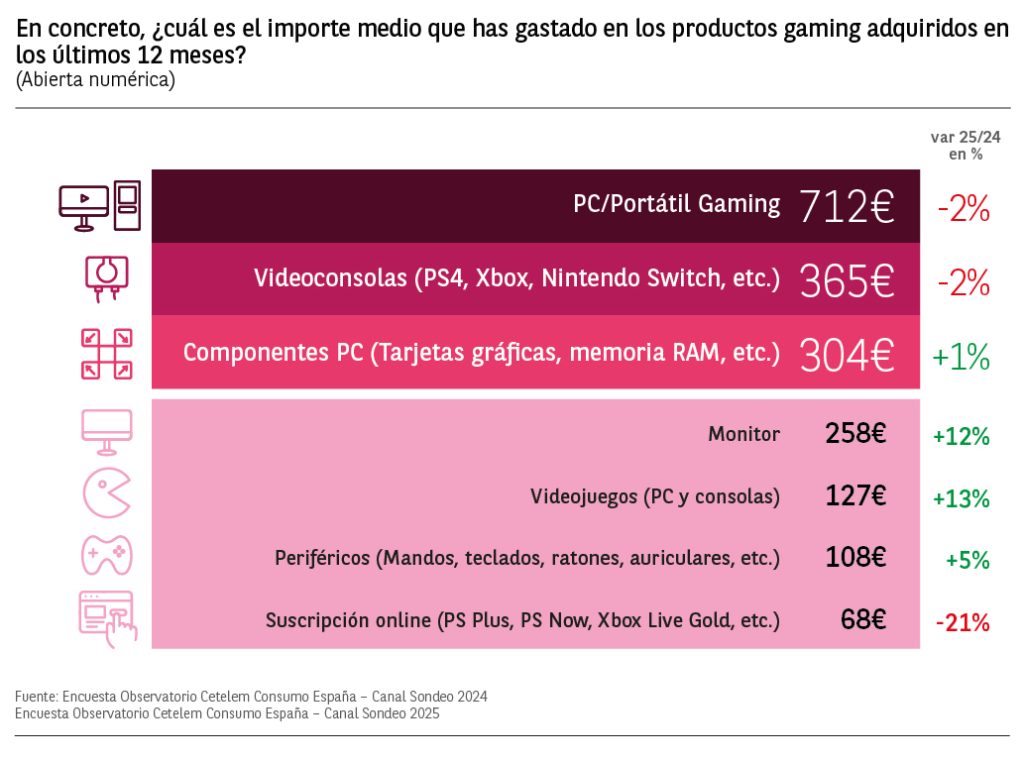 Las 3 categorías donde más han gastado los consumidores españoles han sido en PC y portátiles gaming (712€), videoconsolas (365€) y componentes de PC (304€). El gasto medio aumenta de forma notable en videojuegos y monitores.