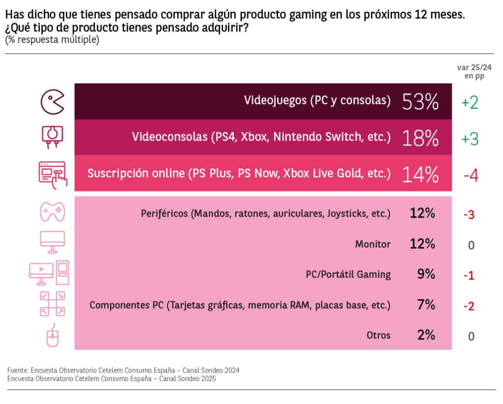 Los españoles encuestados tienen intención de gastar una media de 313€ en sus compras gaming en los próximos 12 meses, lo que supone un aumento del 6% respecto a la intención de gasto mostrada para este 2025.