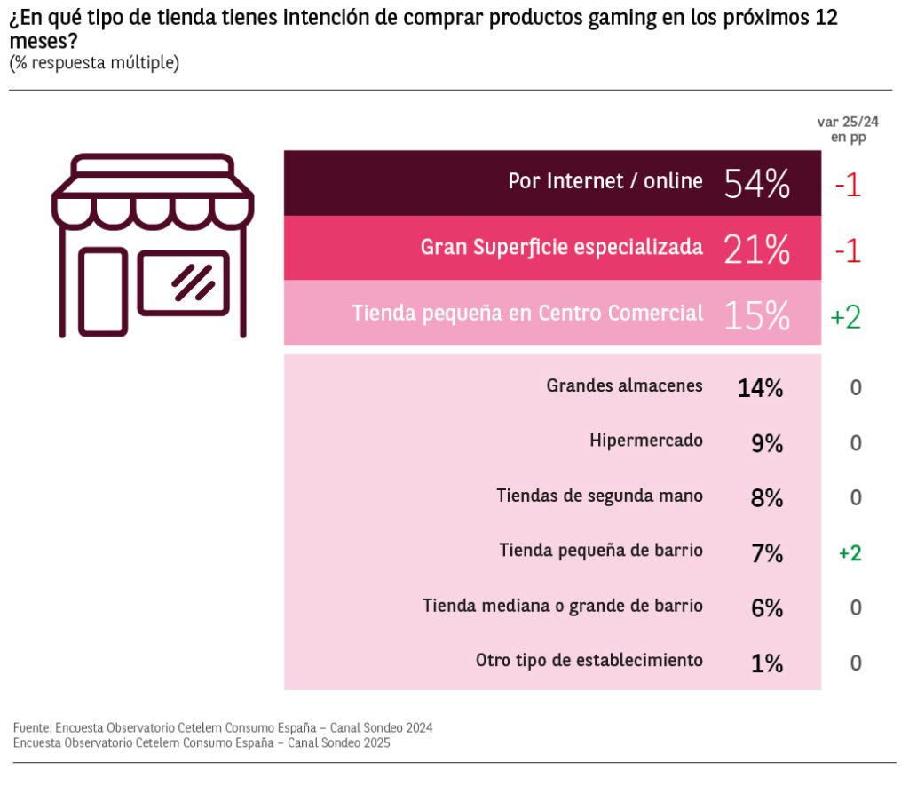 El 54% de los españoles encuestados tiene intención de realizar sus futuras compras gaming en las tiendas online (un punto menos que el año anterior). Por detrás volvemos a encontrar con un 21% a los que pretenden comprar en grandes superficies especializadas y con un 15% a los que pretenden comprar en tiendas pequeñas de centros comerciales.