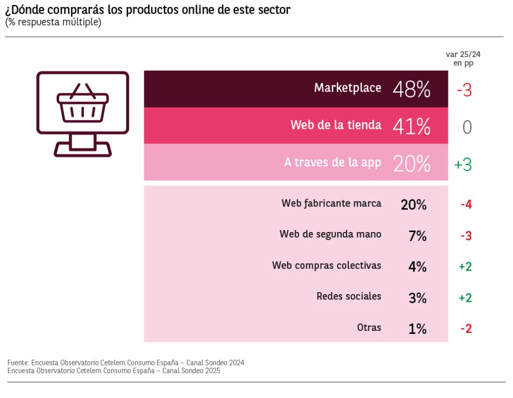 De los que pretenden comprar online, casi la mitad lo hará en marketplaces, descendiendo esta intención de compra en 3 puntos porcentuales. Le siguen las webs de las tiendas y las compras a través de apps con un 41% y un 20% respectivamente.