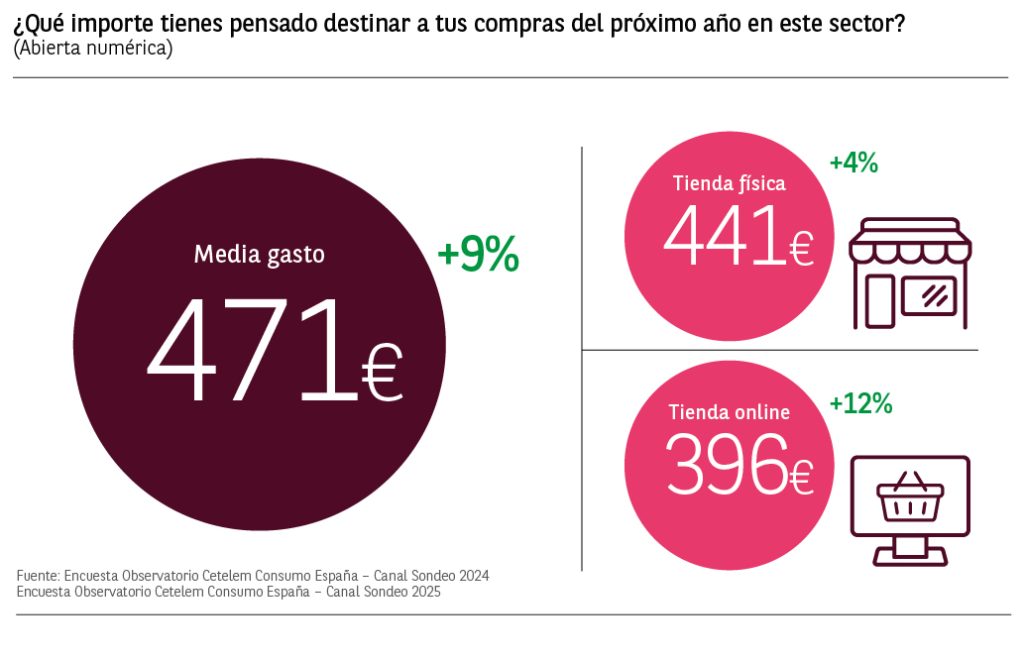 Los españoles encuestados pretenden realizar un gasto medio de unos 471€ en sus compras en este sector durante los próximos 12 meses, un 9% más de lo que pretendían gastar en este 2025.