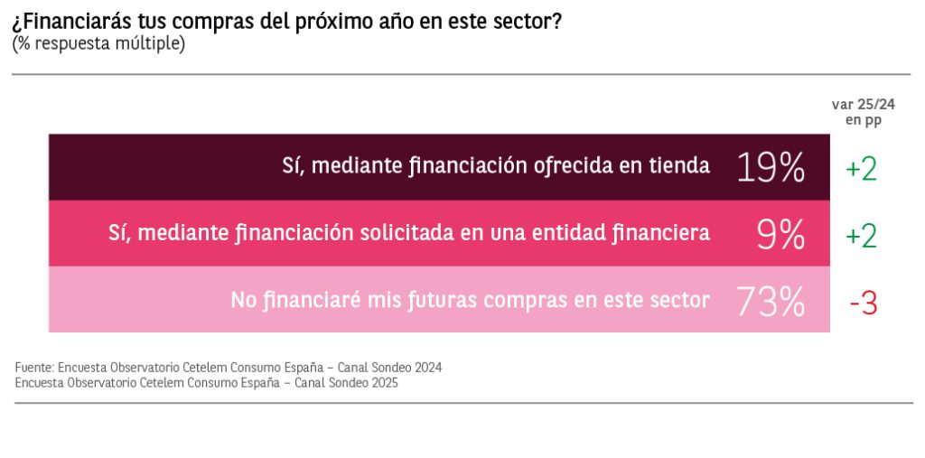 El 73% de los españoles encuestados no pretenden financiar sus compras en este sector durante los próximos 12 meses, descendiendo este porcentaje en 3 puntos porcentuales respecto a lo declarado en 2024.