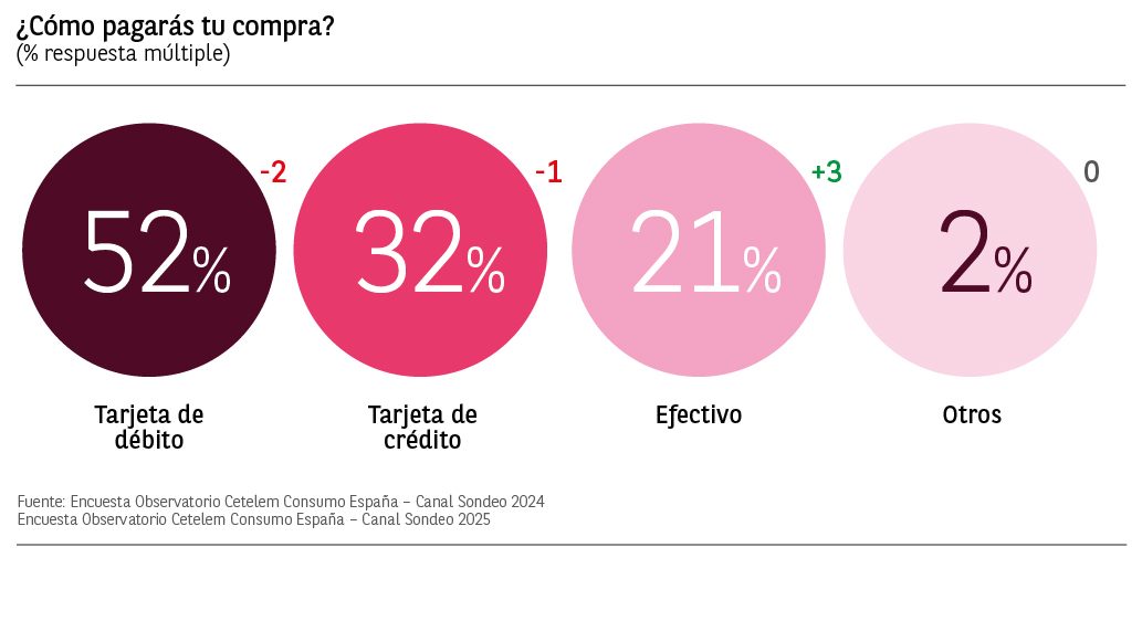 Los españoles encuestados pretenden pagar sus compras mediante su tarjeta de débito en un 52% de los casos. De lejos le siguen los pagos con tarjeta de crédito y el efectivo con un 32% y un 21% respectivamente.