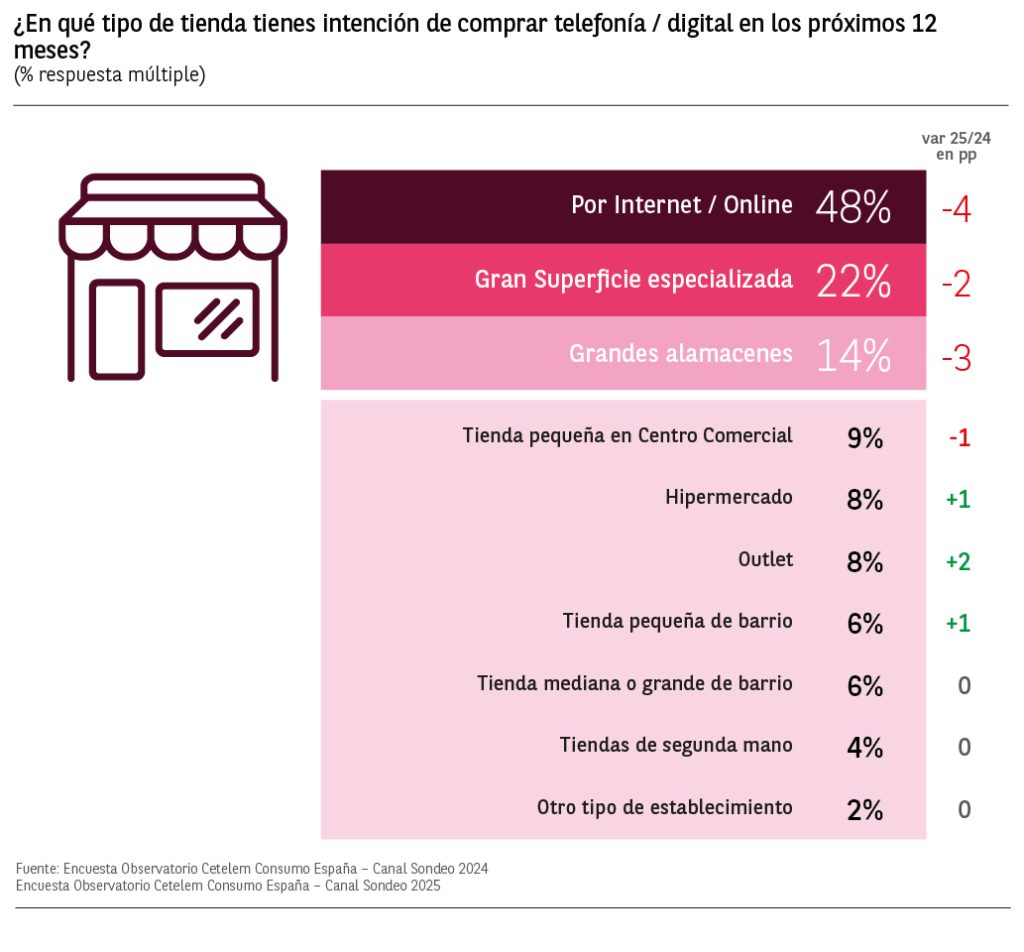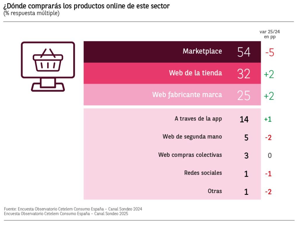 En cuanto al canal de compra en el que pretenden comprar los consumidores durante los próximos 12 meses, el 48% pretende realizar sus compras en este sector a través de la tienda online, seguidos de un 22% que comprará en grandes superficies especializadas y un 14% que lo hará en grandes almacenes. El top 3 es el mismo que aparecía para las intenciones de compra en este 2025.