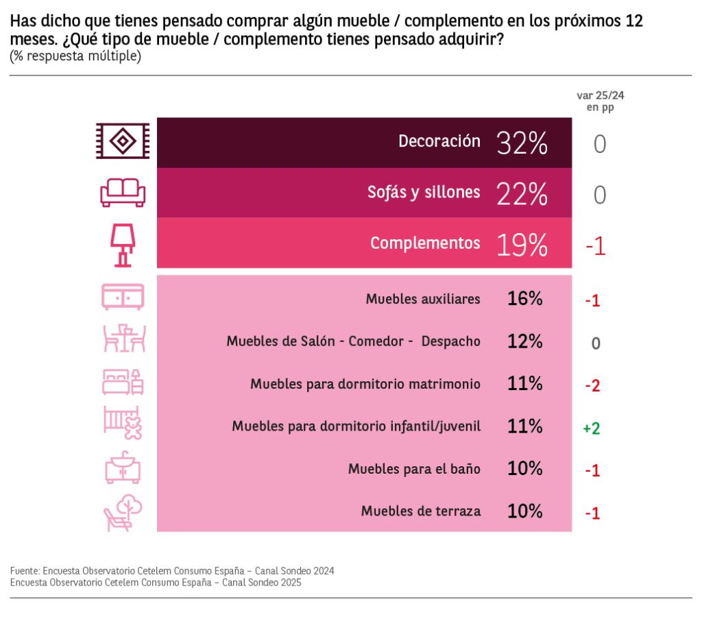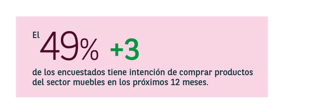 El 49% de los españoles encuestados declara su intención de comprar productos del sector mueble en los próximos 12 meses, 3 puntos por encima respecto a lo manifestado el año anterior.