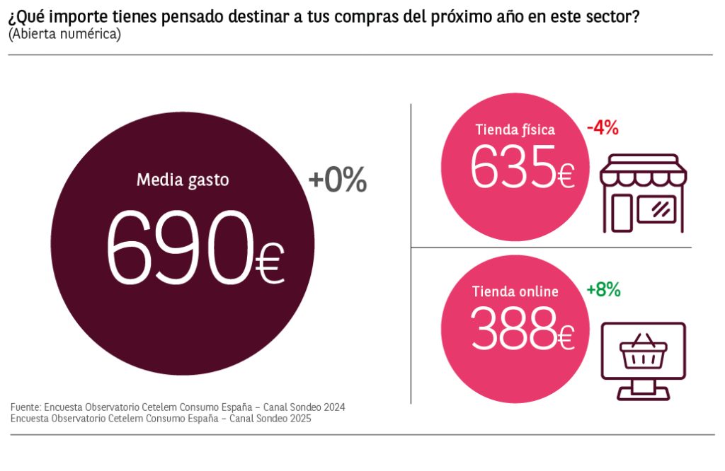 El gasto medio previsto para los próximos 12 meses es de unos 690€, importe que se mantiene estable en relación con lo previsto el año anterior. Los consumidores entre 35 y 44 años son los que realizarán un mayor gasto con un desembolso medio previsto de unos 754€, un 9% más que la media.