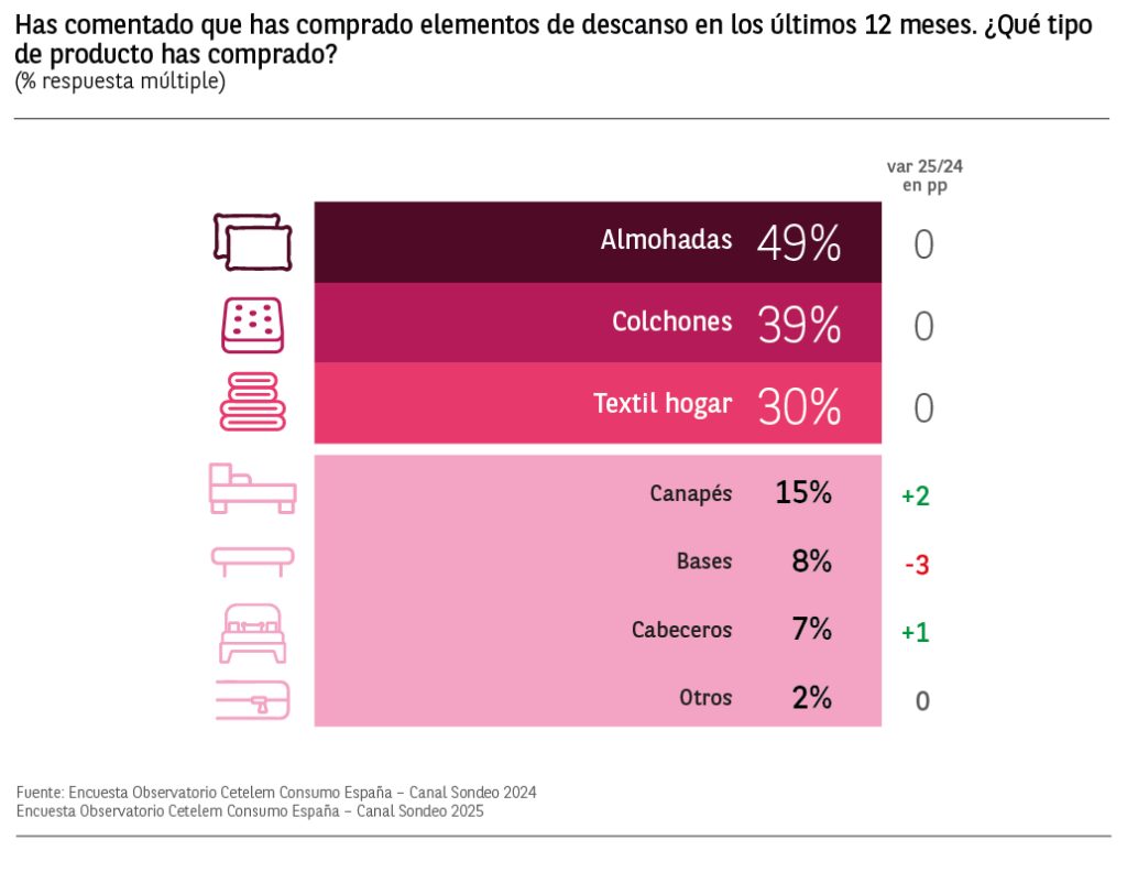 Este año, el top 3 de productos más comprados continúa siendo el mismo que el año anterior la categoría de almohadas ocupan el primer lugar en el ranking con un 49% de menciones, le siguen los colchones (39%) y el textil hogar (30%), manteniéndose las tres categorías estables respecto a 2024.