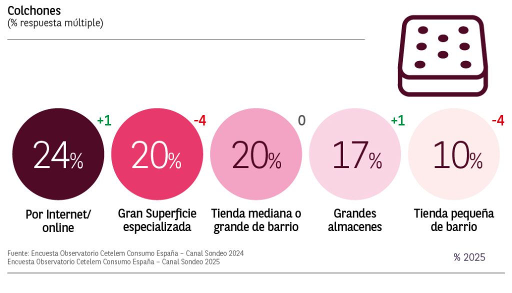 La gran superficie especializada pasa de ser la favorita para realizar la compra de colchones, a ser la segunda opción mostrando un descenso de 4 puntos. El canal online se posiciona en primer lugar con un ligero crecimiento de 1 punto respecto a 2024.