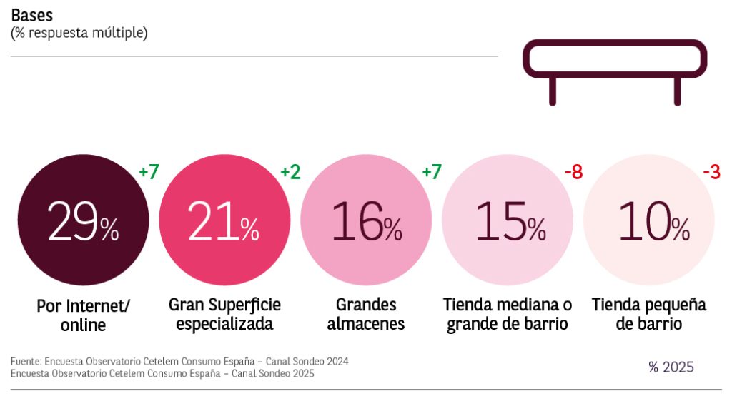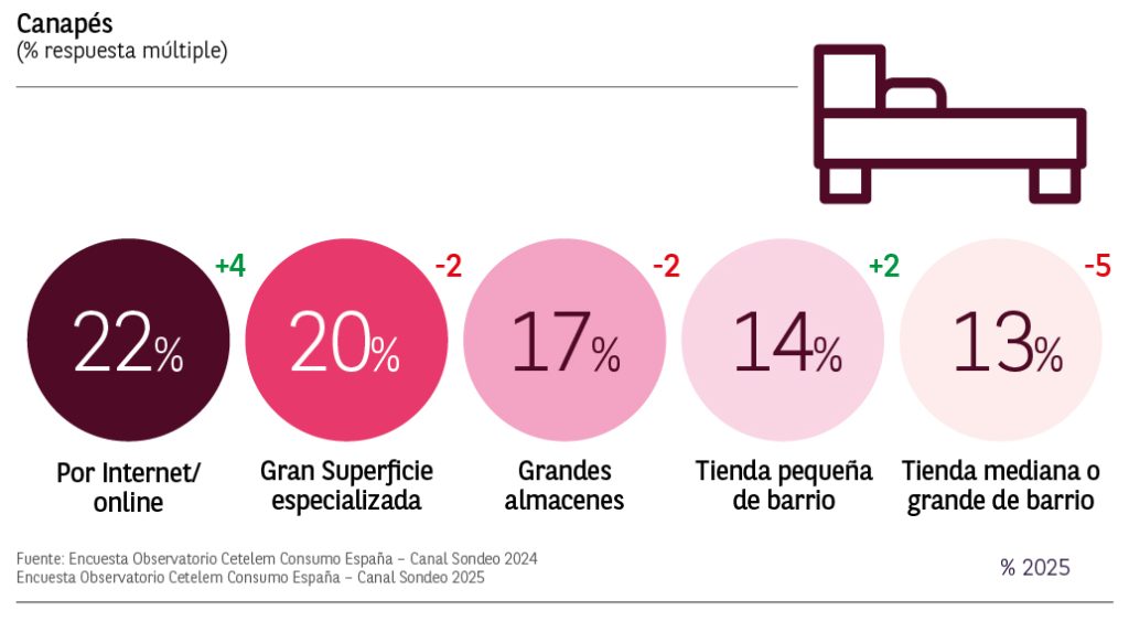 El canal online también se posiciona como favorito en las compras de canapés, con un 24% de respuestas y un crecimiento de 4 puntos respecto a 2024. Las grandes superficies especializadas y los grandes almacenes son los siguientes tipos de tienda más utilizados, pero mostrando una caída de 2 puntos.