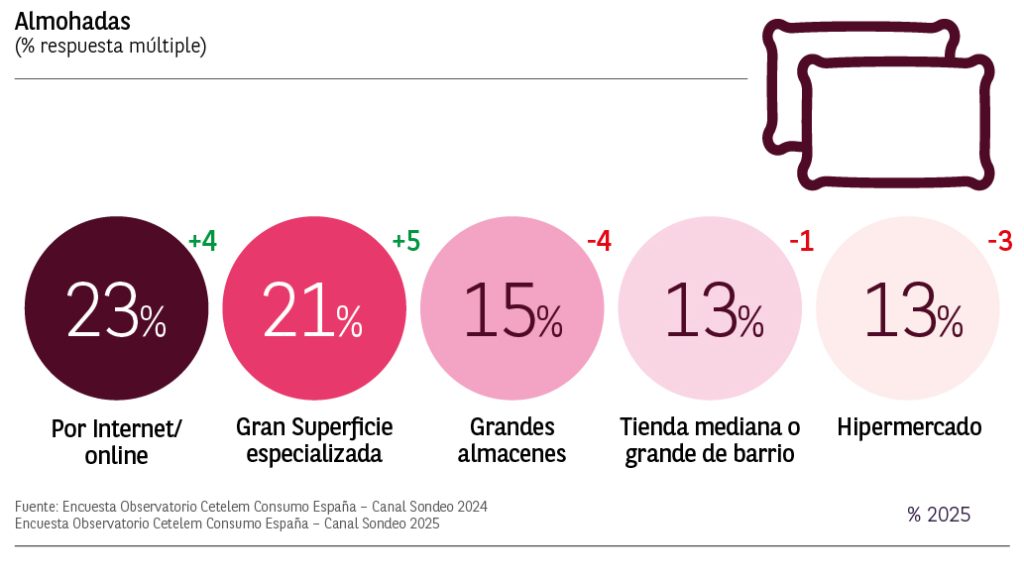 Las compras online y en las grandes superficies las grandes favoritas para la compra de almohadas, mostrando importantes crecimientos de 4 y 5 puntos respectivamente.
