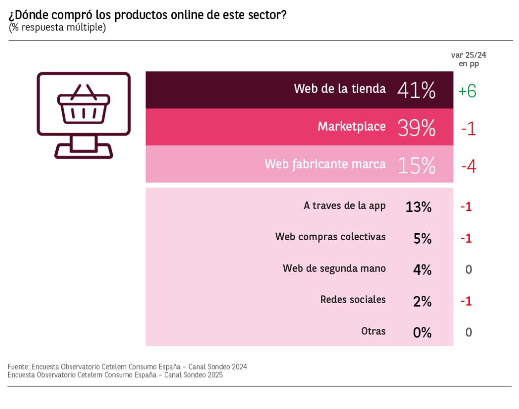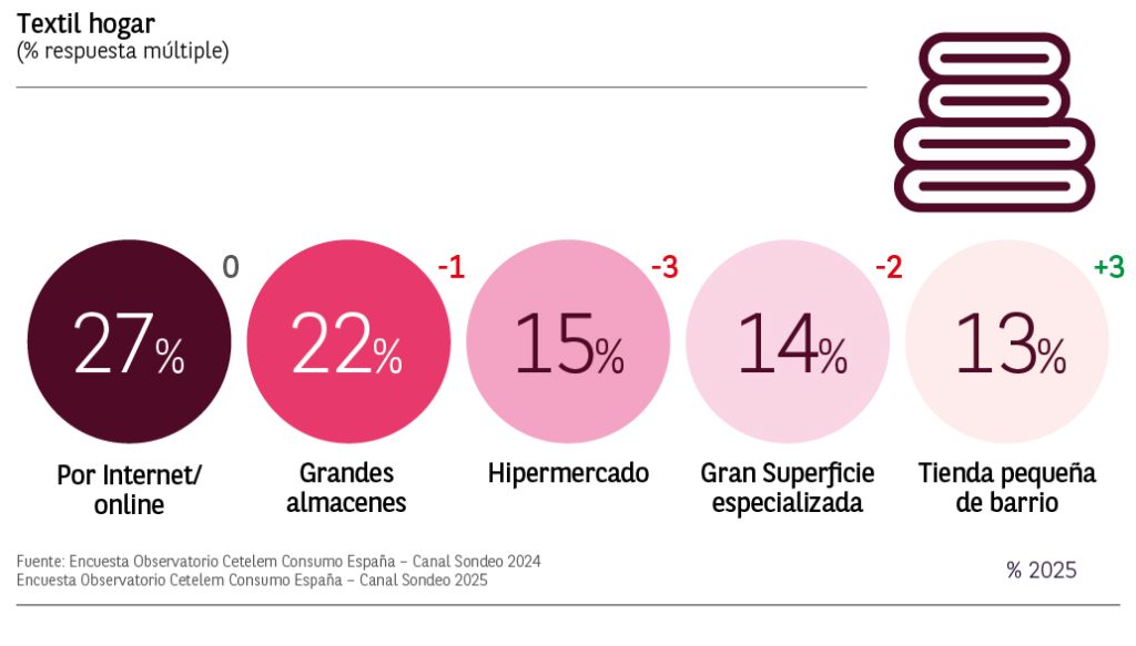 Las compras de productos de textil/hogar se realizan principalmente por internet con un 27% de menciones manteniéndose estables respecto a 2024. Le siguen las realizadas en los grandes almacenes (22%) que descienden ligeramente 1 punto.