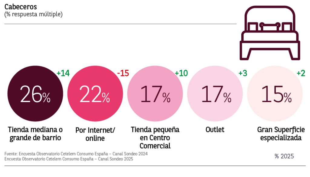 En lo que respecta a la compra de cabeceros, el canal online pierde 15 puntos y se coloca en segunda posición con un 22% de menciones. El primer lugar pasa a ocuparlo las tiendas medianas y grandes de barrio con un fuerte crecimiento de 14 puntos respecto a 2024. El Top3 lo cierra la tienda pequeña en centro comercial con un 17% de respuestas y un importante crecimiento de 10 puntos respecto al año pasado.