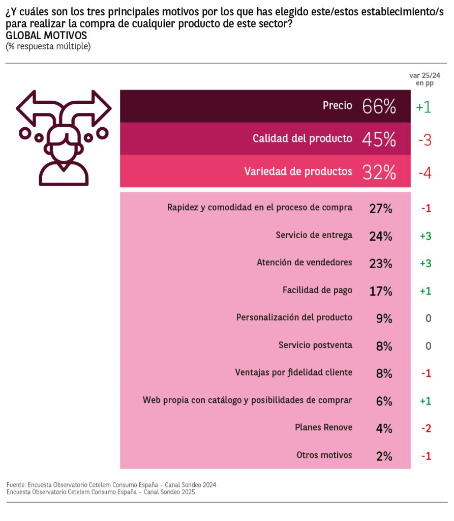 Le siguen la calidad del producto y la variedad de productos, ambos muestran caídas de -3 y -4 puntos respecto al 2024.