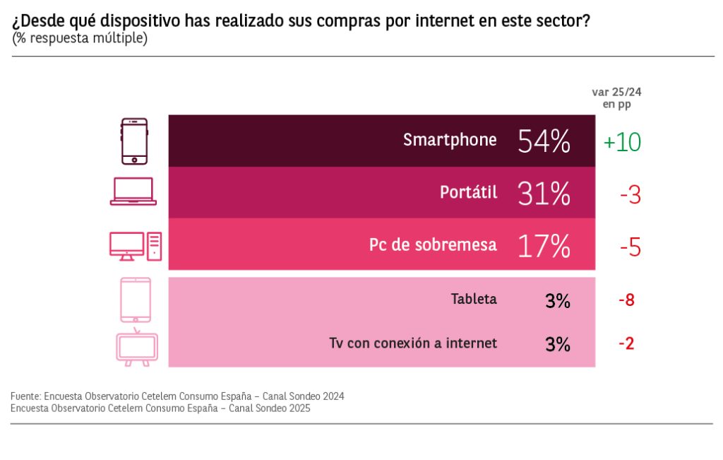 En lo que se refiere al dispositivo utilizado para las compras por internet el smartphone es el claro favorito con un 54% de respuestas obtenidas, y un importante aumento de 10 puntos respecto a 2024.