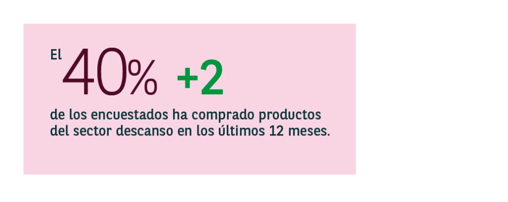 El 40% de los españoles encuestados ha comprado productos del sector descanso, mostrando un crecimiento de 2 puntos respecto a 2024. Si segmentamos por edad, destacan notablemente por encima de la media, los consumidores más jóvenes entre los 18 y 24 años y los 25 y 34 años con un 52% y un 54% de menciones respectivamente.