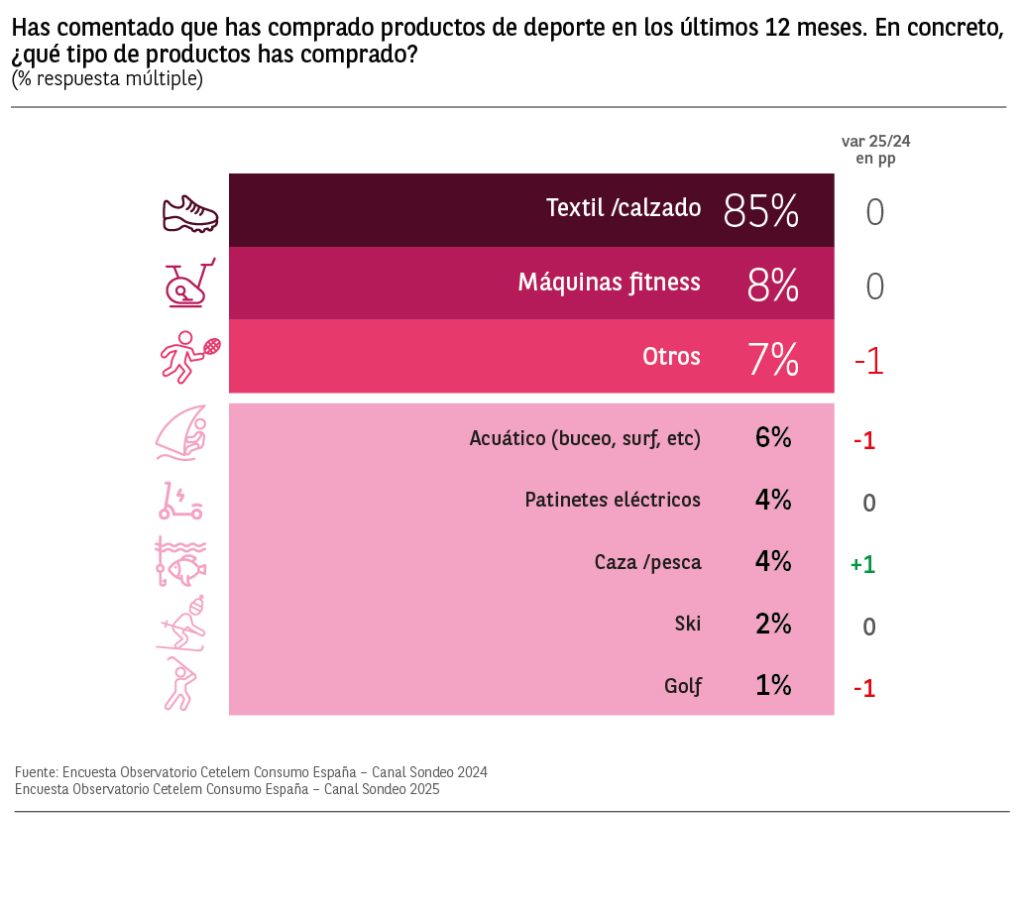 En lo que respecta a las categorías de deporte adquiridas por los consumidores durante el último año, el textil y calzado vuelven a ser claramente los más demandados con un 85% de menciones, mismo porcentaje que en 2024. El resto de categorías preguntadas presentan datos muy inferiores, el 8% afirma haber adquirido máquinas fitness, el 6% equipo para deportes acuáticos (7% en 2024) y el 4% patinetes eléctricos.