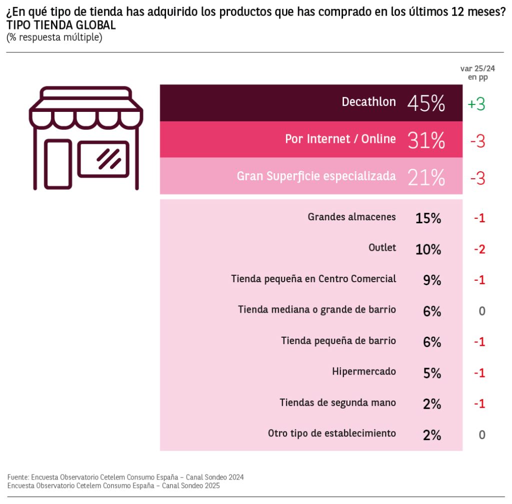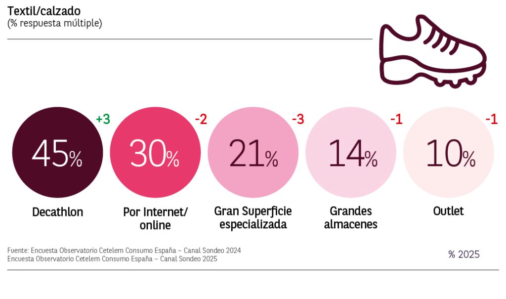 Analizando los canales de compra para cada categoría de producto, en el caso del textil y el calzado deportivo, en primer lugar, nos encontramos las compras en Decathlon (45%), seguidos de las compras online con un 30% de menciones y un descenso de 2 puntos respecto a 2024. El top 3 lo cierran las grandes superficies especializadas que descienden 3 puntos respecto al año anterior (21% vs 24% en 2024).