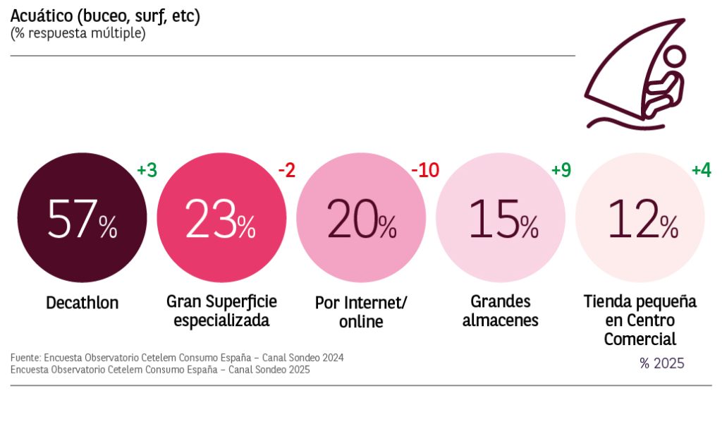 Para las compras de producto deportivos acuáticos, los consumidores vuelven a optar en primer lugar y muy claramente por Decathlon con un 57% de menciones y aumentando en 3 puntos respecto al año anterior. Muy de lejos le siguen la gran superficie especializada y el canal online con un 23% (-2pp vs 2024) y un 20% (-10pp vs 2024) de menciones respectivamente.