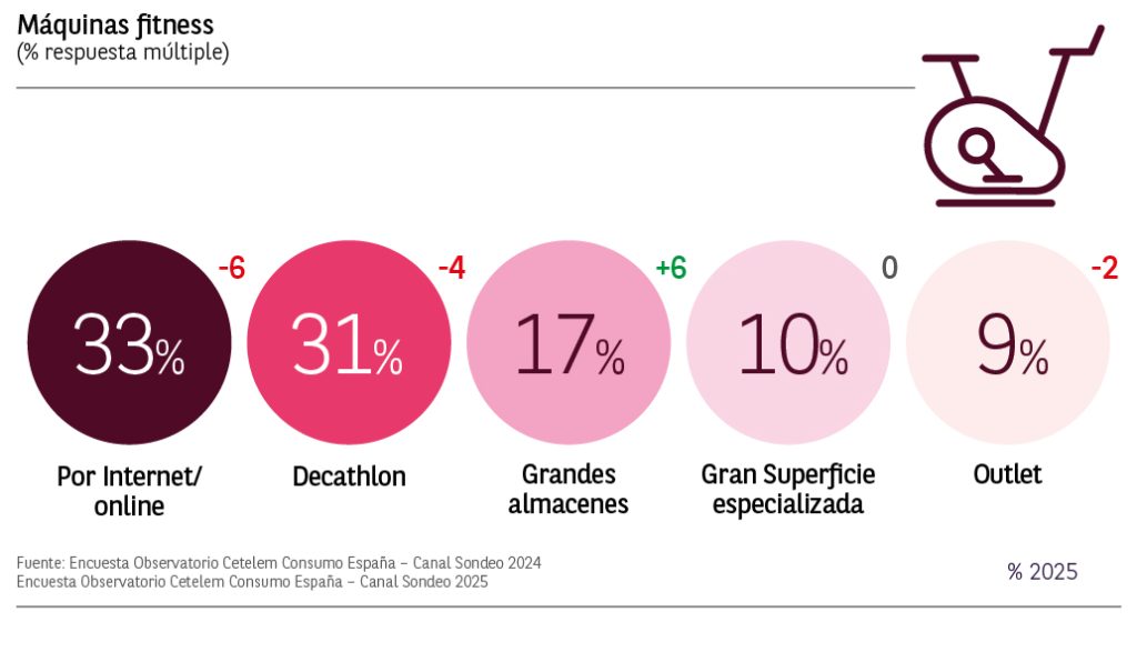 Para las máquinas fitness, los consumidores vuelven a optar por las compras online con un 33% y por Decathlon con un 31% de menciones, aunque ambas descienden en 6 y 4 puntos respecto al año anterior. Muy de lejos le siguen los grandes almacenes con un 17% y una subida de 6 puntos.