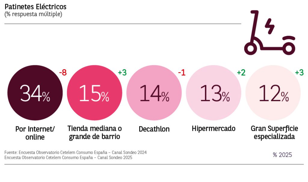 En la categoría de patinetes eléctricos, los consumidores optan en primer lugar y muy claramente por la tienda online con un 34% de menciones, aunque desciende 8 puntos respecto al año anterior. Por detrás aparecen las tiendas medianas o grandes de barrio con un 15% (+3pp vs 2024) y Decathlon con un 14% de menciones (-1pp vs 2024) .