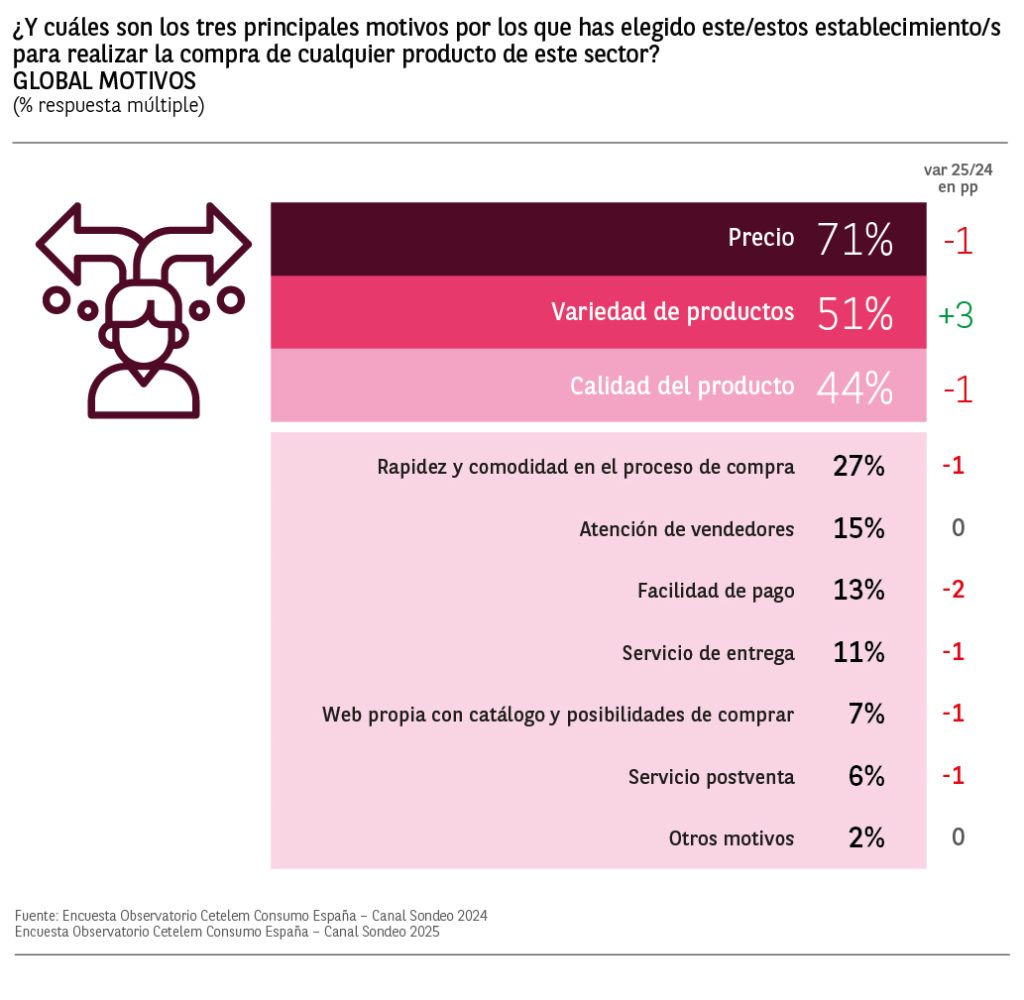 En cuanto a los motivos que llevan a los consumidores a decidirse por comprar los productos de deportes en un establecimiento u otro, en general, el precio es lo más importante, seguido por la variedad de productos que se ofrece y por la calidad. En todos los motivos se aprecian descensos respecto a 2024 excepto en los que ven la variedad de productos como un aspecto determinante a la hora de elegir tienda.