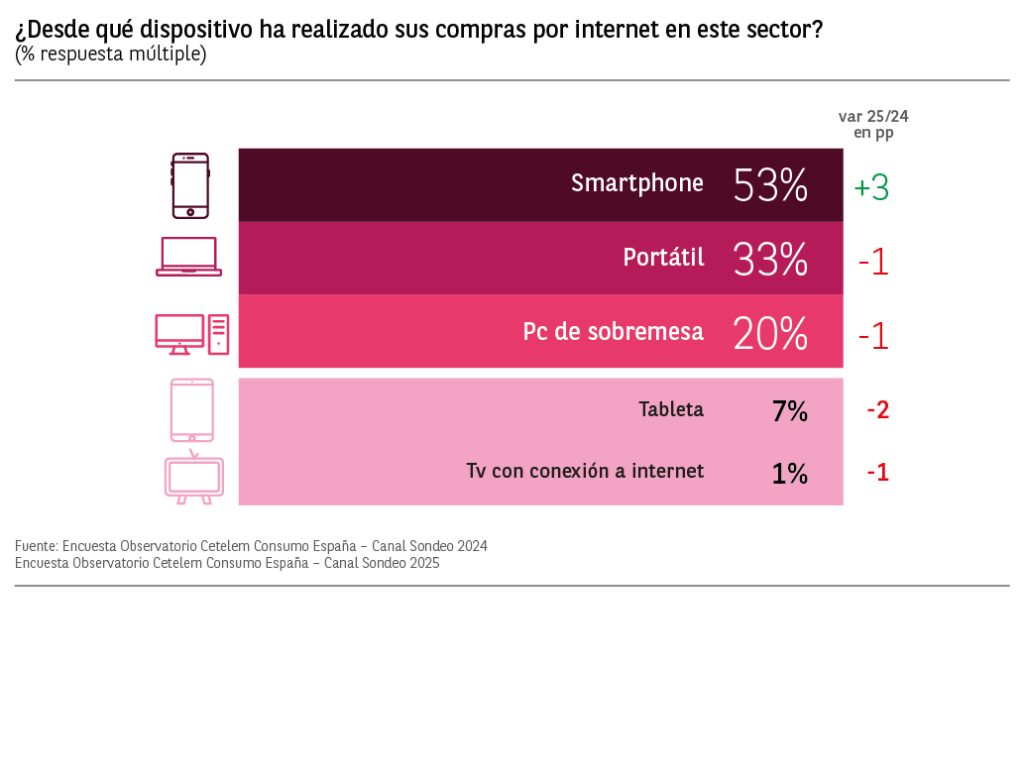 El dispositivo más utilizado para las compras online del sector deporte y el único que crece respecto a 2024, vuelve a ser el smartphone con un 53%. Las compras desde el portátil y desde el PC de sobremesa alcanzan el 33% y el 20% de menciones respectivamente.
