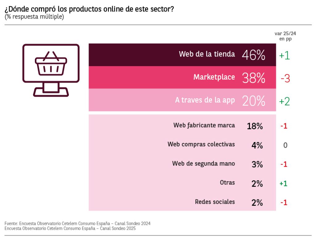 Entre los que han comprado online, el 46% lo ha hecho a través de las webs de las tiendas, seguido por los que utilizan los marketplaces y las apps con un 38% y un 20% respectivamente.