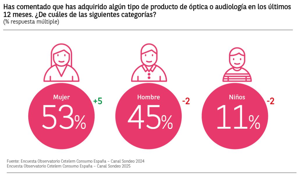 Entre los españoles que han adquirido algún producto de óptica en el último año, encontramos que el 53% lo ha hecho en la categoría de productos de mujer que aumenta 5 puntos respecto a 2024, seguido del 45% (-2pp vs 2024) que ha comprado en la categoría de productos de hombre.La categoría de niños vuelve a ser la menos solicitada con un 11% y con un descenso de 2 puntos.