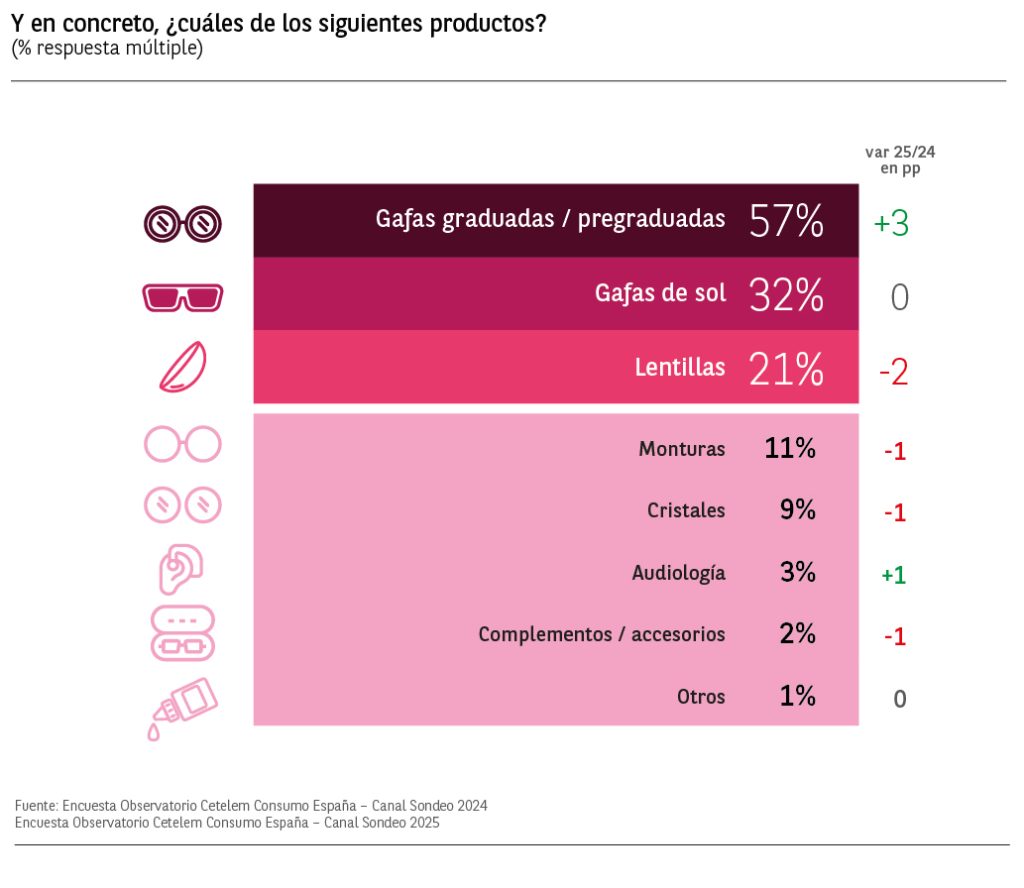 Entre los productos de óptica más comprados, vuelven a estar en primer lugar las gafas graduadas con un 57% de menciones y un aumento respecto al año anterior de 3 puntos porcentuales. Le siguen las gafas de sol con un 32%, y las lentillas que descienden 2 puntos.