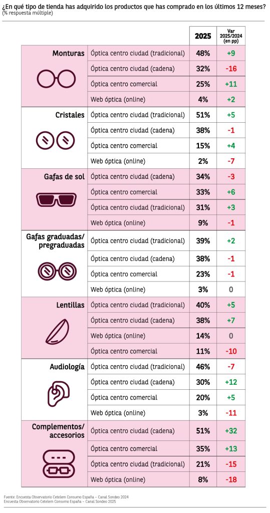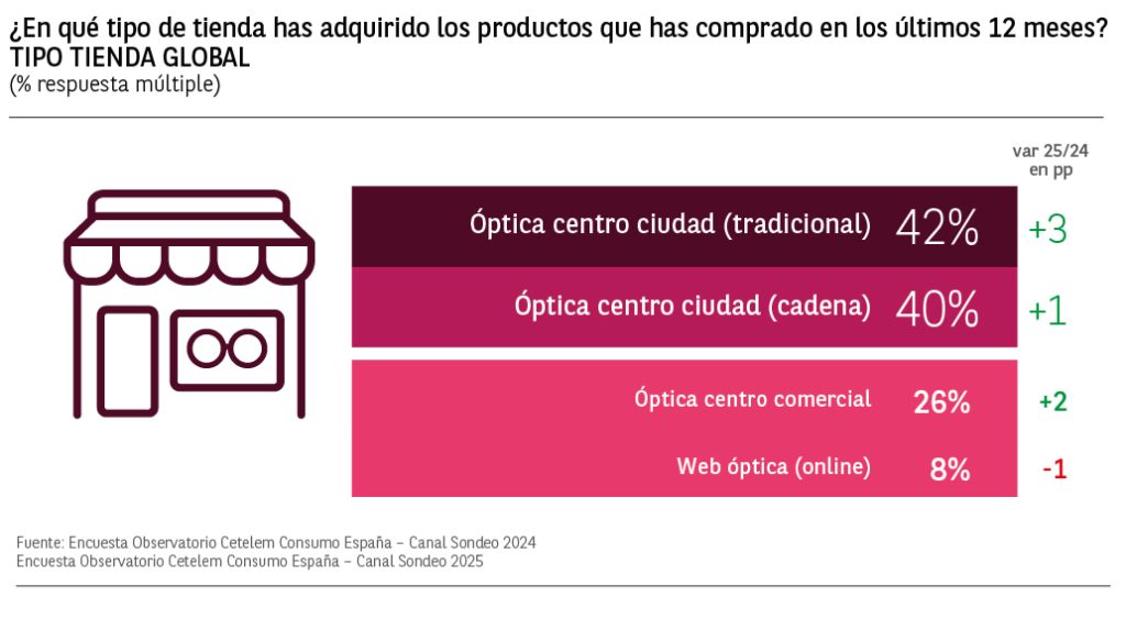 El porcentaje de compradores en las cadenas de ópticas de centros de ciudad bajan al segundo lugar en el ranking, aunque también aumentan un punto respecto a 2024.