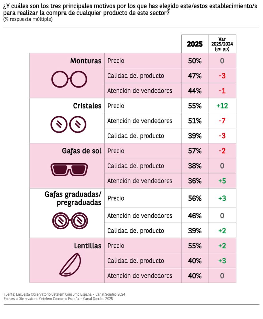 En cuanto a los motivos que llevan a los compradores de productos de óptica a decidirse por un tipo de tienda u otro, el precio sigue siendo el factor más mencionado con un 60% de menciones, mostrando un notable aumento de 4 puntos respecto al año anterior.