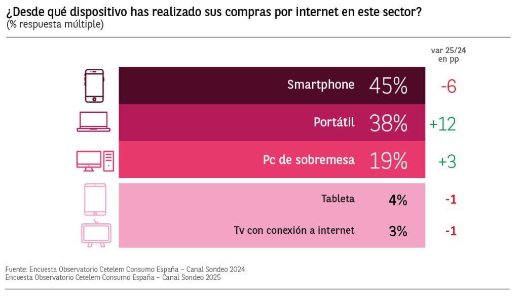 Las compras a través del portátil son las siguientes más mencionadas (38%), siendo los consumidores entre los 25 y 34 años los que destacan en este sentido con un 60% de respuestas, 13 puntos por encima de la media.