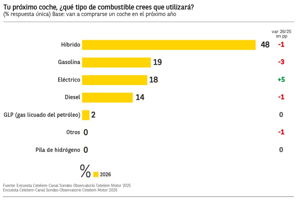 De cara al futuro, el híbrido se mantiene como la opción preferida en niveles similares a 2025 con un 48% de intención de compra. El vehículo eléctrico gana terreno y crece 5 puntos hasta el 18%, mientras que los coches de combustión tradiconal caen 3 puntos hasta el 19% , en el caso de la gasolina, frente al y el diésel que se sitúa en 14% y desciende 1%.