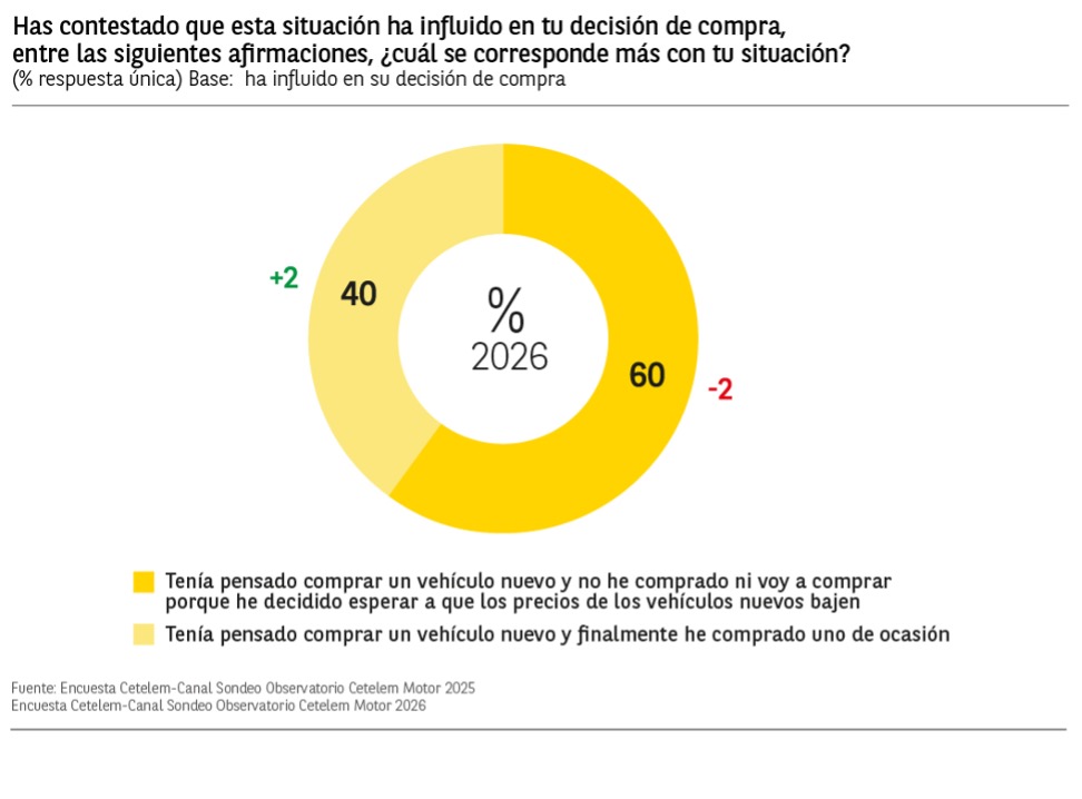 El impacto del precio en la decisión de compra aumenta significativamente frente a 2025. El 47% de los conductores afirma que ha influido en su decisión, 12 puntos más respecto al ejercicio anterior, y de ellos, el 60% ha optado por retrasar la compra de un vehículo nuevo. Además, el 81% tiene en cuenta el coste total de uso de su automóvil (23% mucho y 58% bastante), consolidando un perfil de consumidor más racional y planificado.