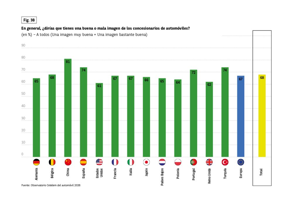 La valoración de los concesionarios de automóviles es positiva en términos generales y especialmente sólida en España. En el mercado español, el 74% de los encuestados afirma tener una muy buena imagen de los concesionarios, un dato claramente superior a la media europea, situada en el 67%. A nivel internacional, España iguala a Turquía, también con un 74%, y supera a países como Alemania (65%), Francia (67%), Italia (67%) y Estados Unidos (61%).